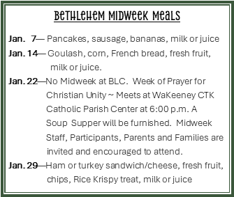 MidWeek at Bethlehem Lutheran Church is open to ALL children (Pre-K through 8th Grade). It begins @ 6:00 p.m. every Wednesday evening (September-April) with a delicious meal prepared by Ruth Shiltz, Margaret Schmitt, Myrna Mai and Bev Armbruster. After the meal around 6:30 p.m., the children meet in the sanctuary. Then, from 6:45-7:30p.m., the children have their religion classes. Parents are encouraged to eat with their children! Volunteers for MidWeek are ALWAYS needed and appreciated!! It’s going to be a great school year full of learning and fun!