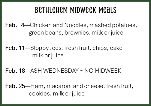 Meal begins at 6:00 p.m. Midweek dismisses at 7:15 p.m. instead of 7:30 p.m. during Lent beginning Feb. 25.